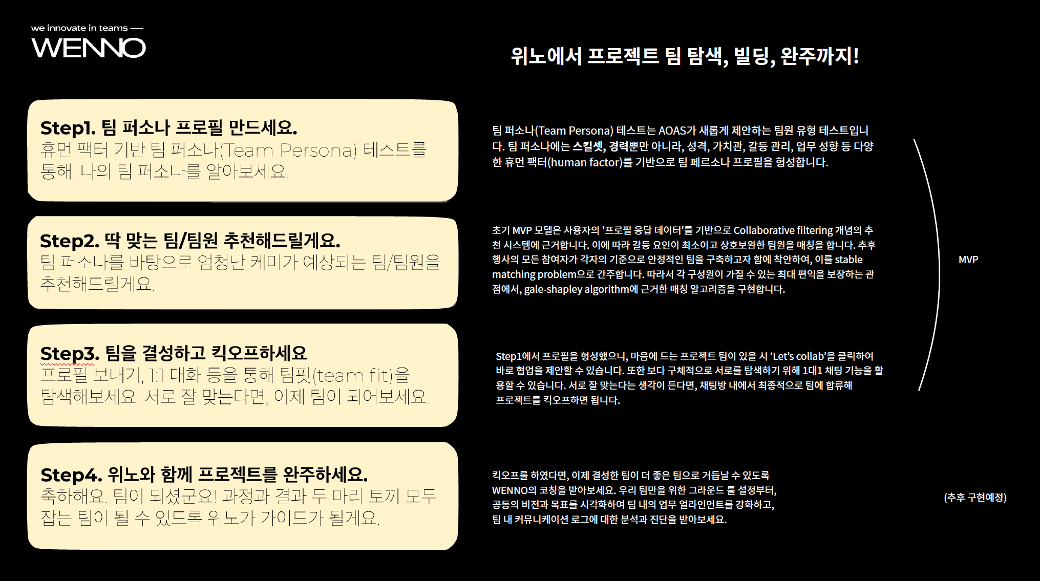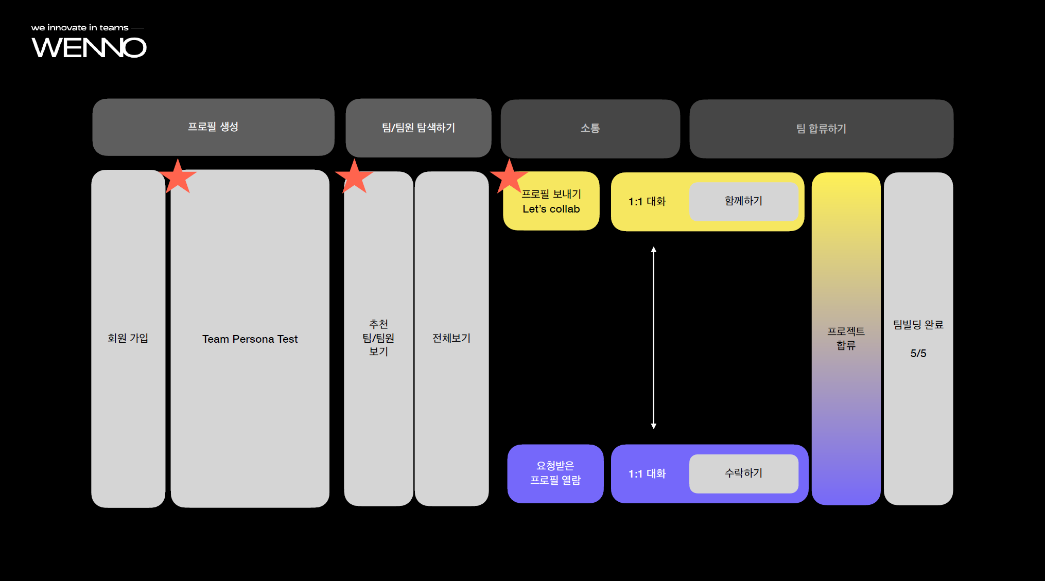 - 위 두 가지 I want/I can을 바탕으로 어떻게 프로젝트/타 유저와의 ‘케미’를 %로 나타낼 수 있을지 기준 마련.