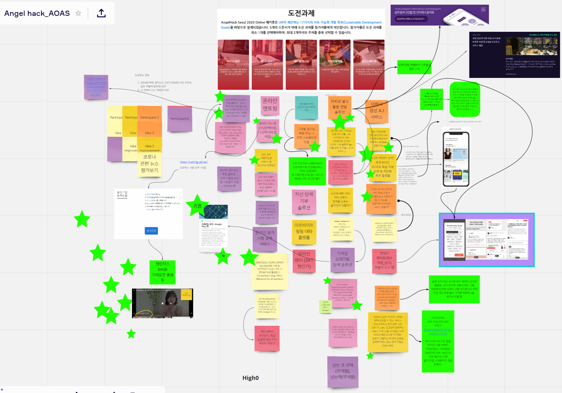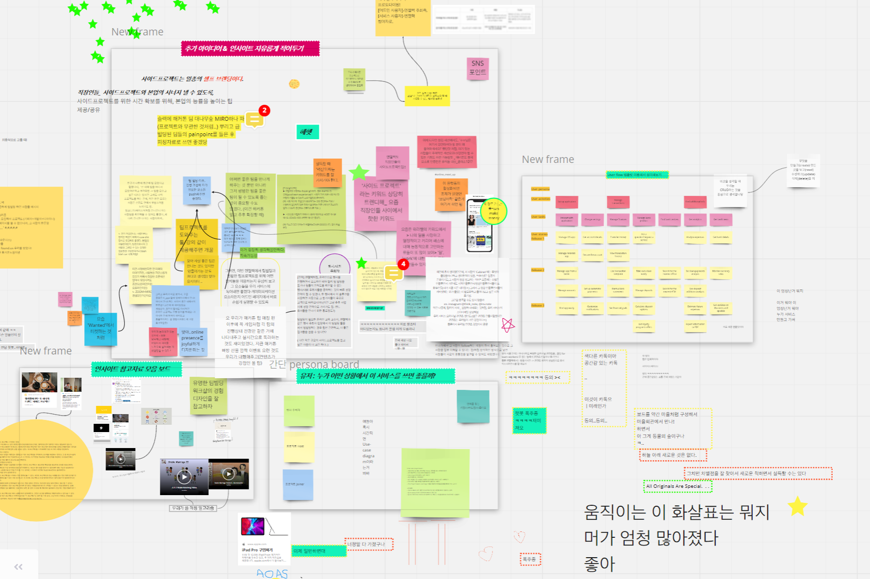 이번에는 Miro 보드로 어떤 문제를 탐색해볼까, 함께 이야기해보는 시간을 가졌다. SKT 행복인사이트에서 교훈을 얻었던 우리. 이번에는 문제든 솔루션이든 가리지 않고 일단 자유롭게 주제별로 포스트잇을 붙이며 서로 의견을 교환했다. 이 중 많은 사람들의 표를 받은 (초록색으로 반짝이는 별이 보이는가?) 아이디어들을 따로 옮겼다.