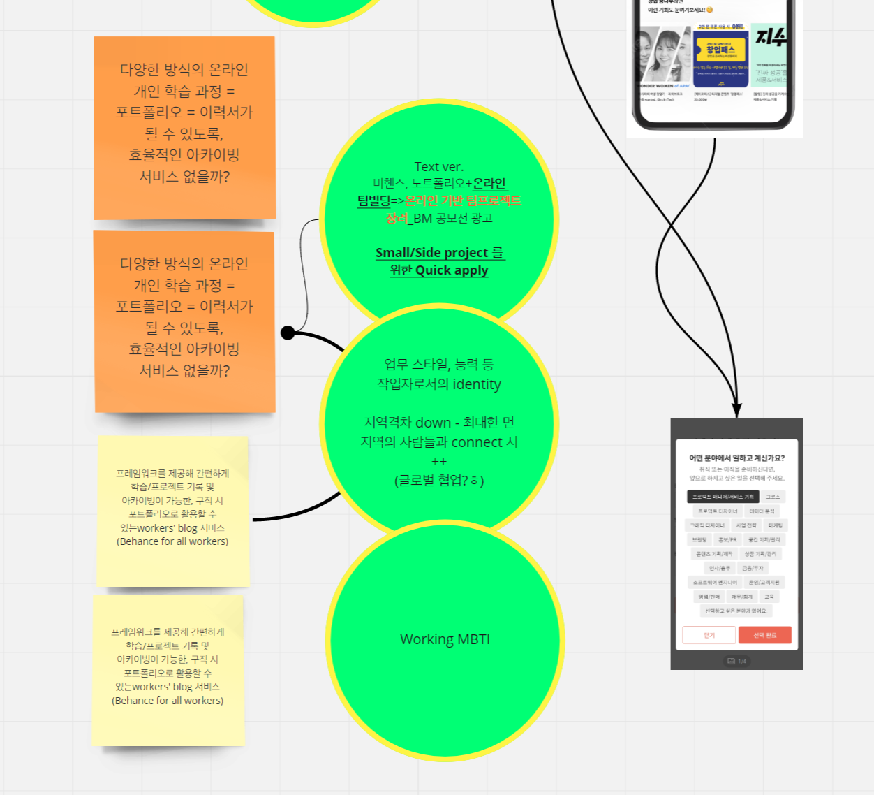 이 중 어떤 아이디어를 골라야 할지 다들 침묵을 지키던 와중, 깊은 고심에 휩싸인 내가 질문을 하나 했다. 위의 주황&노랑 포스트잇(한 묶음으로 취급)에 관한 의문이었는데, 해당 포스트잇만 봐서는 기존의 블로그 서비스나 링크드인 등과 다른 점이 대체 뭔가 싶은 거였다. 기획자 버전의 behance를 만들고 싶다는 취지였는데, 프레임워크를 제공하든 다양한 개인학습을 공유할 수 있도록 하든, 그거 다 지금도 사람들이 알아서 잘 하고 있는 것이지 않은가. 그래서 산이 내 의문에 대해 조금 더 길게 자신의 아이디어를 설명해줬는데 이 중 '온라인 팀빌딩이 가능하다'라는 점에 내가 꽂혔다. '나는 지금 포스트잇에 써져 있는 부분에는 전혀 매력이나 차별점을 느끼지 못하지만, 온라인 팀빌딩은 가능성이 많아 보인다. 코로나로 인해 지역(광주)에서 거주하면서 내가 하고 싶은 프로젝트를 하는 데 많은 현실적인 한계점을 느낀 나라서 더 공감이 되고 이런 쪽으로 차별점을 개발해봐도 좋을 것 같다. 그래서 포스트잇에 적은 부분 말고, 온라인 팀 빌딩에 집중해보면 어떨까 싶다. 그렇다면 나는 이 아이디어에 찬성이다.'라고 어필했고, 팀원들도 이 부분에서 유레카 포인트를 느껴 갑자기 아이디어 논의가 활발해졌다. '이런 기능이 있으면 어때?' '이런 방향도 재미있겠다' '이런 BM도 가능하겠네!' 등 너무 많은 아이디어가 쏟아졌고, 우리의 상상 속에서 이 큰 그림은 이미 LinkedIn을 능가하는, 너무나 유쾌하고 활발한, facebook 뺨다구를 후려갈기는 아이디어가 되어 있었다. "이러다 우리 돈 너무 많이 벌겠는데?"