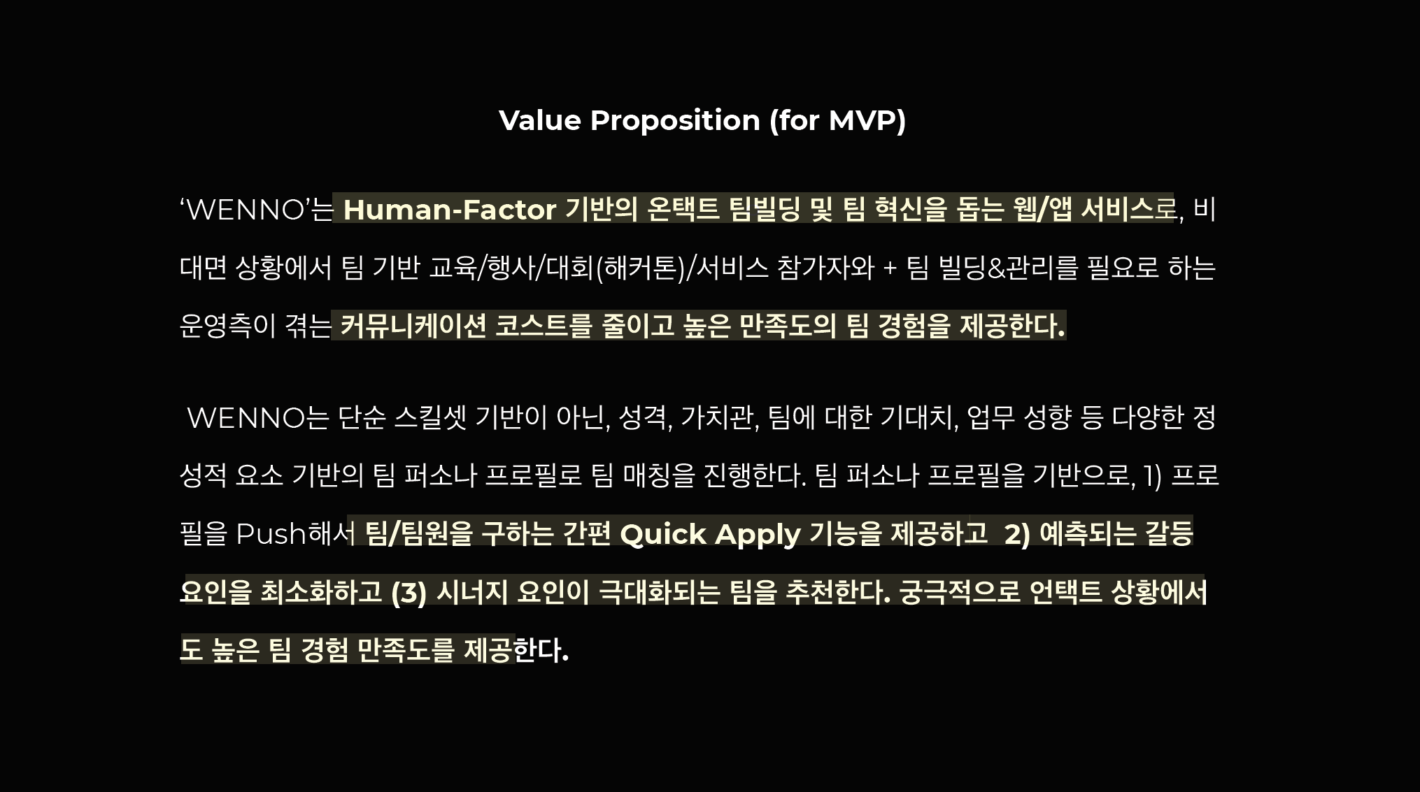 사람마다 해커톤 참여의 needs가 다를 것이다. 능력치 높은 팀원들만을 원할 수도 있지만, 과연 최고의 결과를 내는 팀이, 정말 최고의 능력치만을 가진 팀인 걸까? (관련 리서치 제시.todo) 해커톤은 모든 멤버들이 제대로 커뮤니케이션할 수 있도록 코스트를 줄여 주어야 한다.
