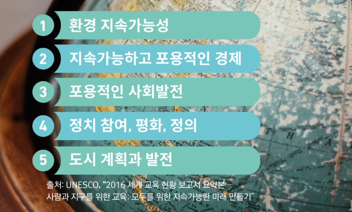 "지속가능발전, 인권, 성평등, 평화와 비폭력문화 확산, 세계시민의식, 문화다양성 존중과 지속가능발전을 위한 문화의 기여 등에 대한 교육을 통해 모든 학습자들이 지속가능발전을 증진하기 위한 지식과 기술을 습득할 수 있게 한다."
