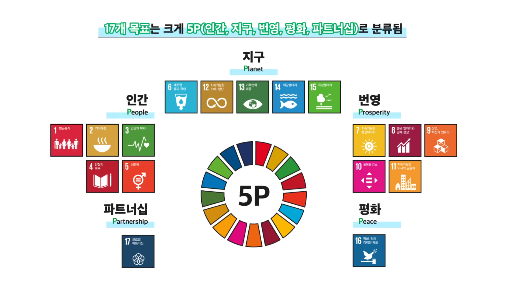 UN에서 선정한 17개의 지속가능발전목표는 5개의 영역으로 구분되어 있으며,