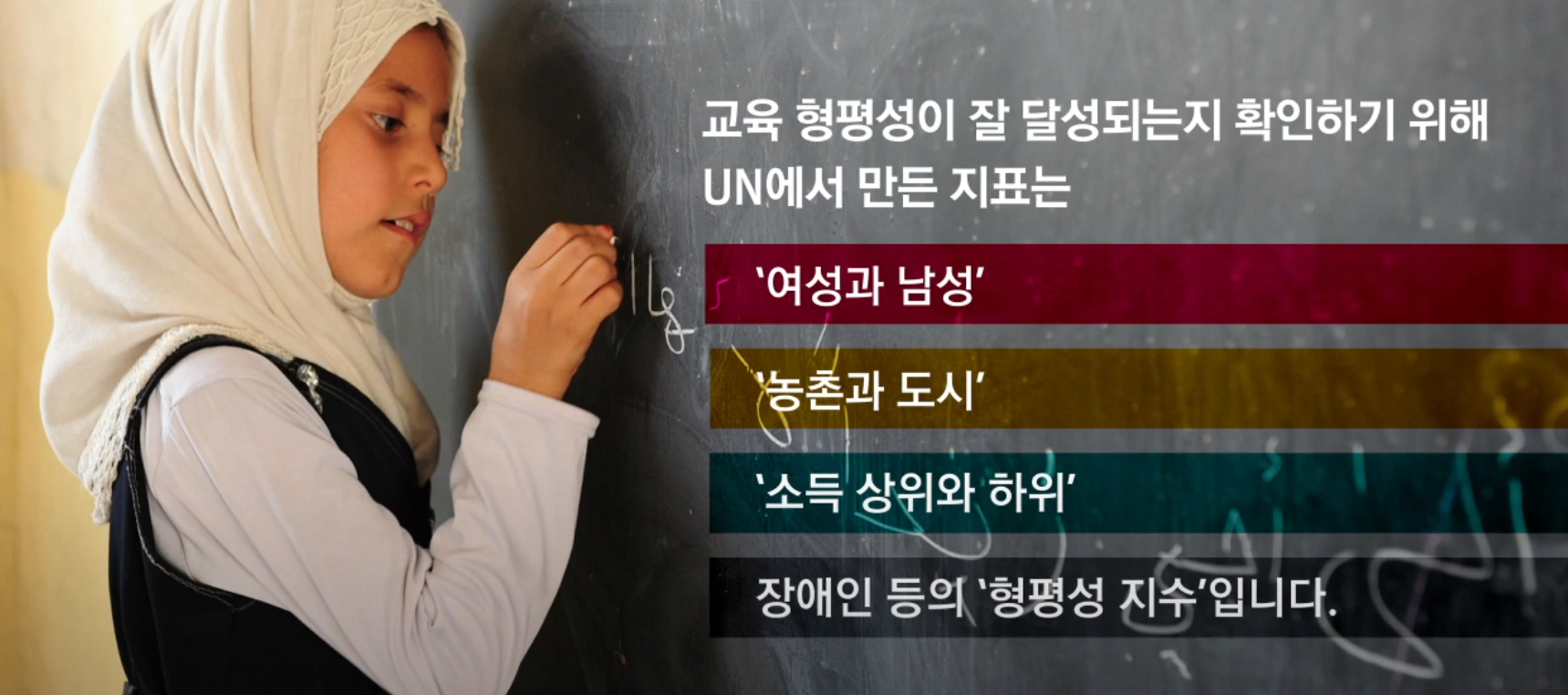 "교육에서의 성불평등을 해소하고, 장애인, 이주민, 취약상황에 처한 아동 등 취약계층이 모든 수준의 교육과 직업훈련에 평등하게 접근할 수 있도록 한다." - 영상링크 (youtu.be/4UTWwCRjh6E)