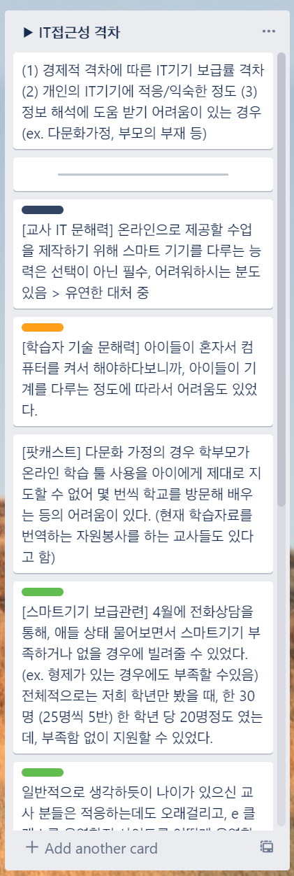 SDG 4에 대해 대략적으로 이해했고, 현재의 대한민국에서 가장 뒤처진 달성목표가 SDG 4.5 취약계층의 교육 형평성이며, UN에서 모든 SDG 추구의 기반으로서 가장 중요하게 생각하는 세부목표는 SDG 4.7 지속가능발전과 세계시민의식 이라는 점도 알게 되었다. 다만, 4.7이 조금 이상의 추구에 관련된 느낌이라면 4.5는 현실에 발 디디고 있는 목표라고 느껴졌다. 그래서 우리는 4.5, 취약계층에 집중하는 게 맞는 선택이지 않을까 하는 확신이 들었다. 확실히 기존에는 그냥 '이렇게 하는 게 옳은 방향인 거 같아 ㅠㅠ' 였다면, 이렇게 설득할 근거가 생기니까 내 자신도 납득이 되고 마음이 편해졌다. 다만 그런 만큼, 높은 수준의 SDG 달성이라는 관점에서 시급하거나 중요하지 않다고 느껴지는 문제로 가자고 한다면 웬만한 설득에는 더 넘어가기가 힘들 것 같은(?) 쎄한 느낌도 들지만 말이다. 허허